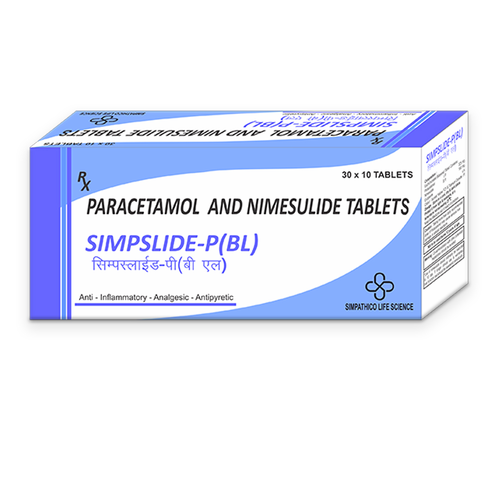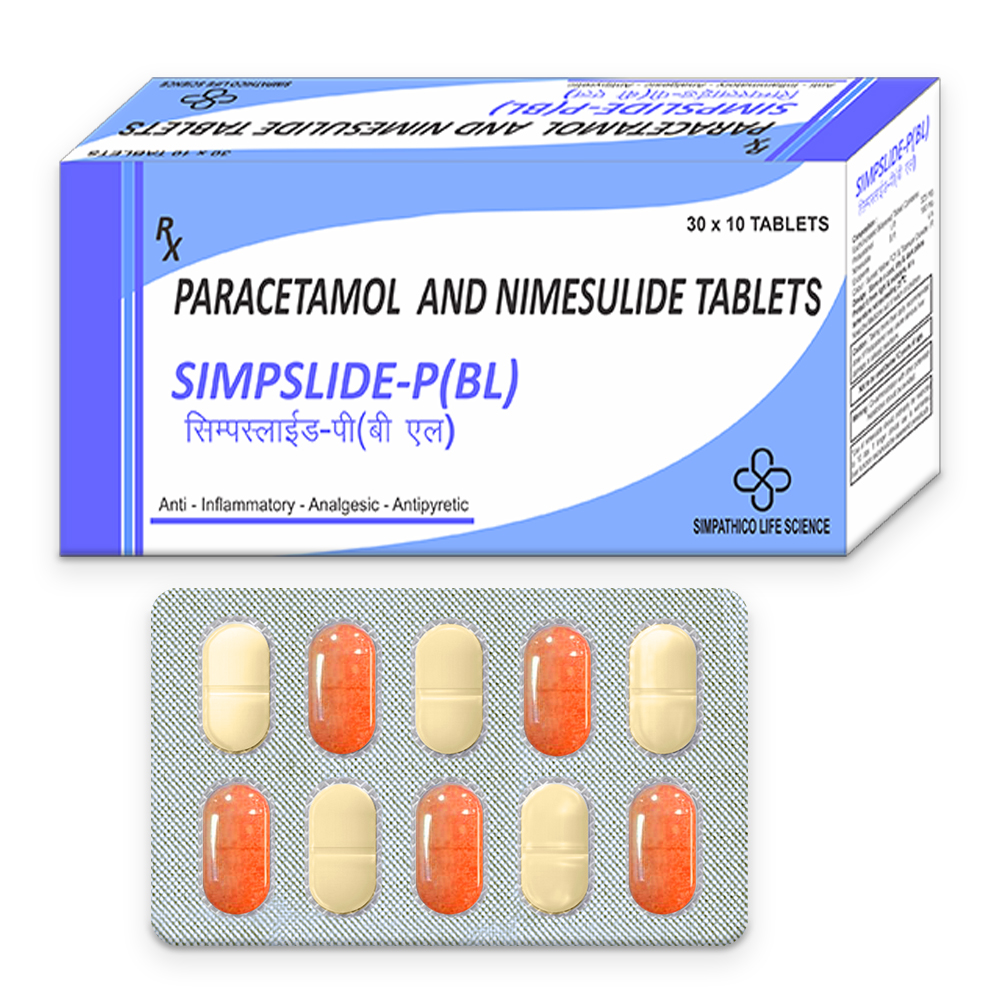 Simpslide-P(BL) tablets are combination of Nimesulide a NSAID & Paracetamol an analgesic and antipyretic. It is used to relieve fever, muscle pain, back pain, toothache, or pain in the ear and throat it is also used to relieve pain and inflammation in conditions like rheumatoid arthritis, ankylosing spondylitis & osteoarthritis.